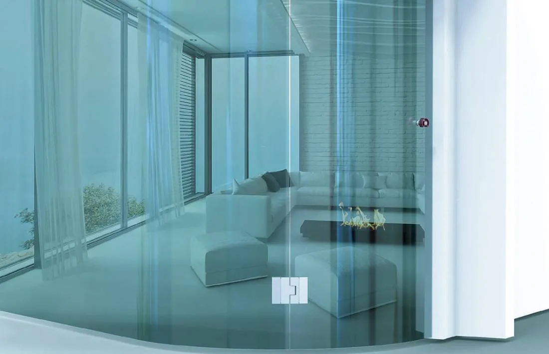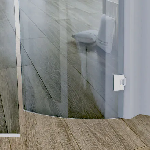 - Bisagra articulada para vidrios curvados, absorbiendo radios mínimos de curvatura de 800 mm.