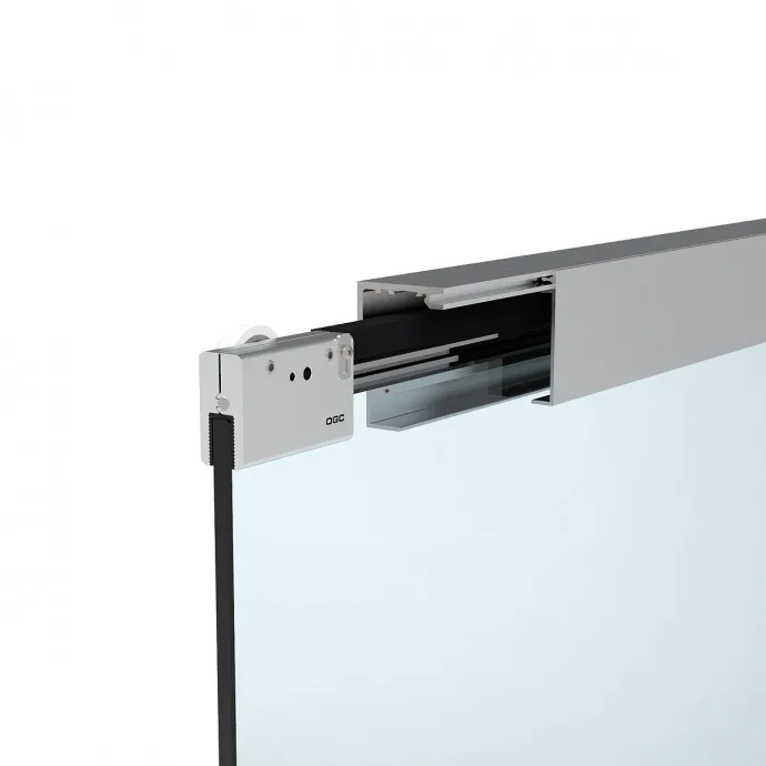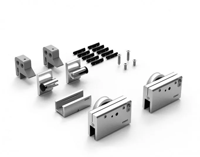 Set completo de accesorios con capacidad de carga de 50kg., para puertas correderas de vidrio que incluye 2 mordazas regulables con sujeción por presión, juego de 2 topes, juego de 2 soportes, 1 guiador de suelo y 10 clips para instalar tapeta embellecedora frontal.